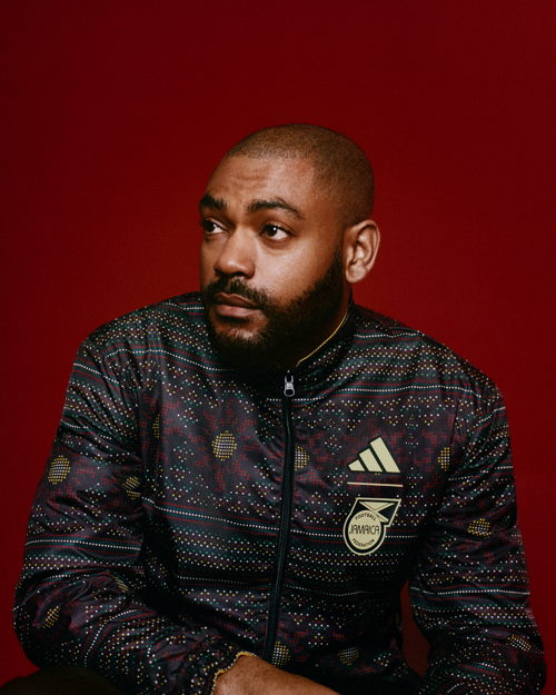 - Una camiseta para antes del partido, usada por los jugadores de la selección nacional mientras calientan antes del juego, que está inspirada en los patrones convencionales encontrados en la ropa de punto tradicional de Fair Isle. Esto da vida a los códigos de diseño de Wales Bonner que tejen la herencia de la diáspora africana con diseños europeos, impregnando el estilo tradicional escocés con colores de los crepúsculos del Caribe, junto a un motivo de sol dorado.
