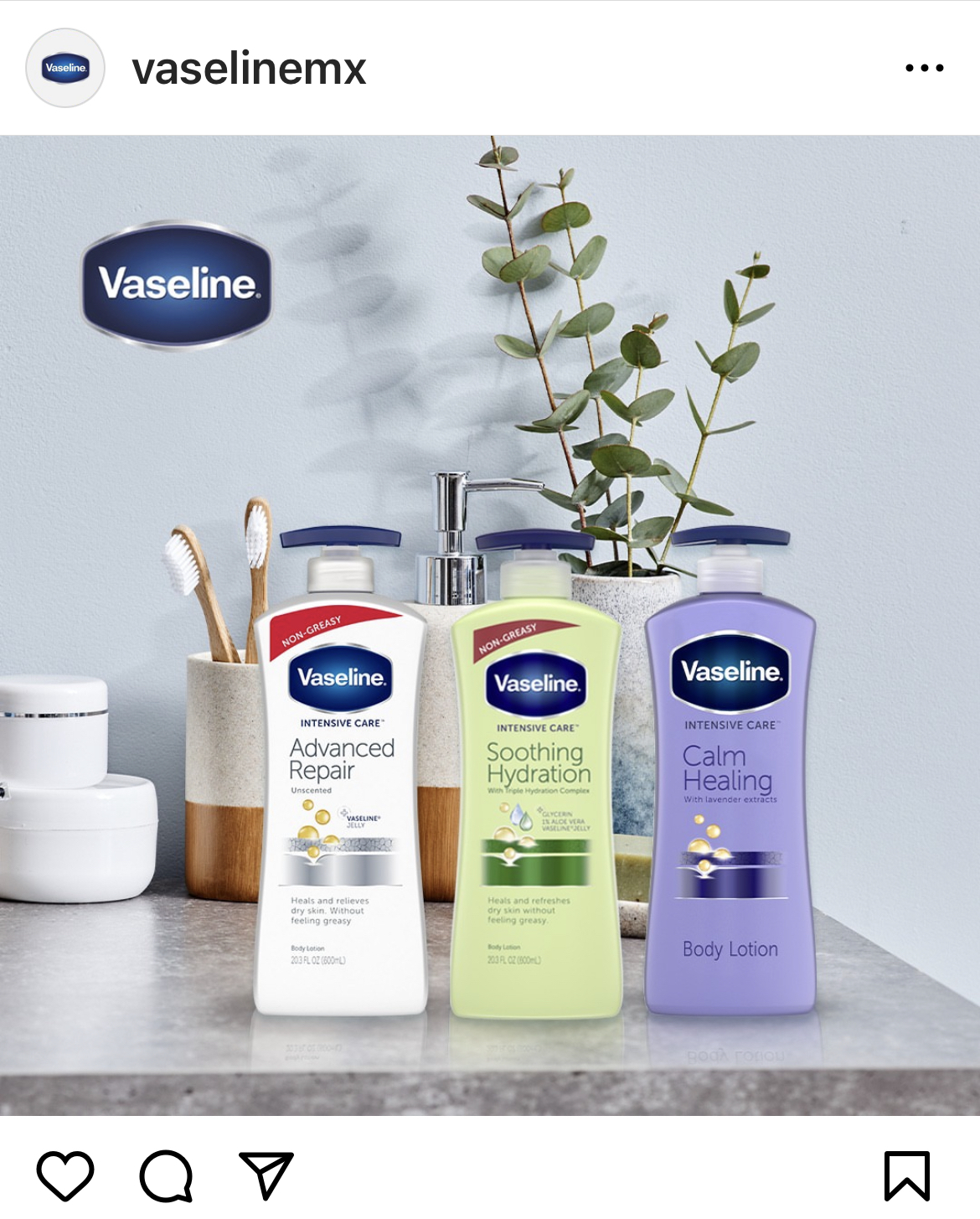 Este activo está presente en la colección Intensive Care de Vaseline, enriquecida con vitamina E, que incluye en su línea el Body Lotion Advance Repair, recomendada para humectar y nutrir, mientras que la Body Lotion Calm Healing, fue diseñada para calmar el dolor de la piel agrietada y mantener la humedad natural del cuerpo.